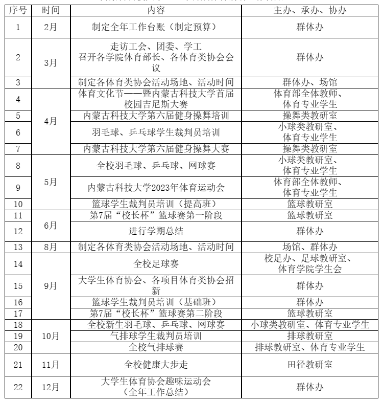 第三阶段(8周以后):恢复到正常锻炼水平,有序开展专项全校群众性体育活动。