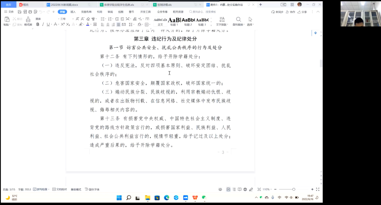 2022年6月16日晚7点30分,milan米兰官网以腾讯会议的形式召开2022年春学期考风考纪教育,会议由党总支副书记武淑琴主持,学工办主任杨乐、辅导员王梦茹、各年级班主任老师、体育教育专业全体同学参加。