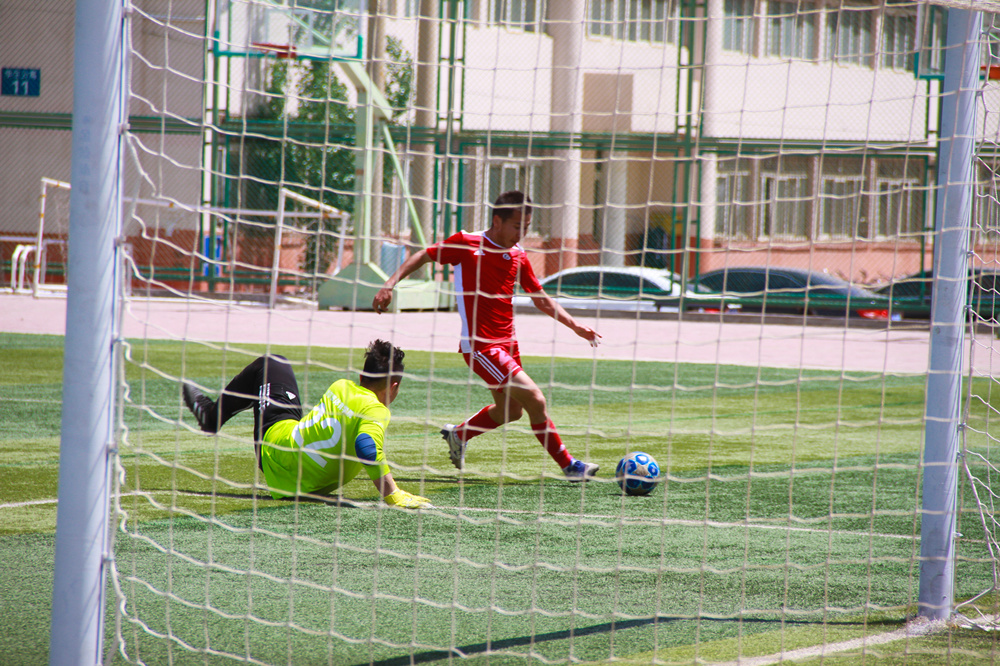 哨声响起,上半场开球。哈尔滨体育学院球员高度警惕、严防死守,内科大球员频频进攻,双方僵持不下。期间,内科大球员数次突袭射门,都被对方成功拦截。在上半场比赛结束前20秒,内科大11号球员包金柱突然冲破对方阻碍,成功射门。