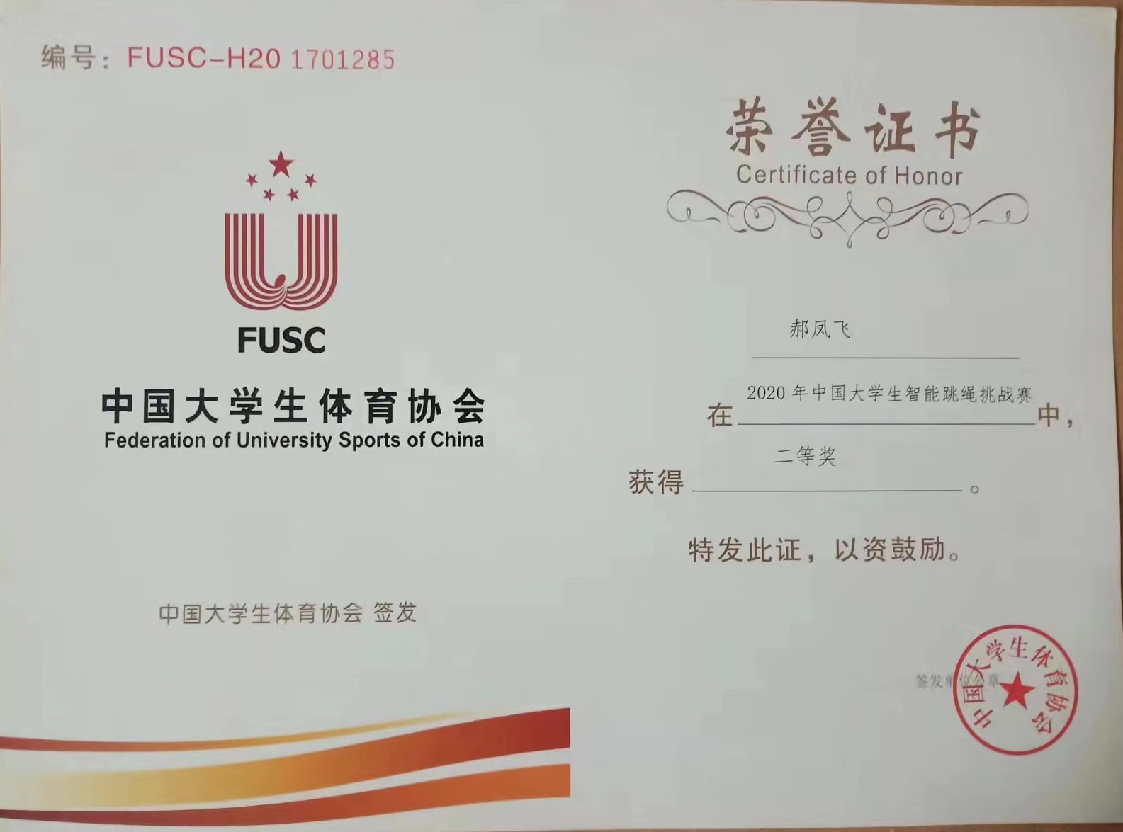 2020年8月,学校组队参加了2020年首届中国大学生智能跳绳挑战赛,学生获得的最好成绩为全国二等奖。
