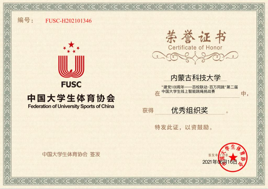 2021年5月10日—6月10日,学校组织参加第二届中国大学生线上智能跳绳挑战赛,在100万次单摇跳排位赛中荣获全国第四名。在持续32天的打卡挑战赛中,milan米兰官网学子凭借坚持不懈的精神,最终共有179名同学获得完赛奖,其中2名同学夺得全国一等奖,7名同学获得全国二等奖,13名同学获得全国三等奖。同时,milan米兰官网获得“建党100周年——百校联动·百万同跳”第二届中国大学生线上智能跳绳挑战赛优秀组织奖。