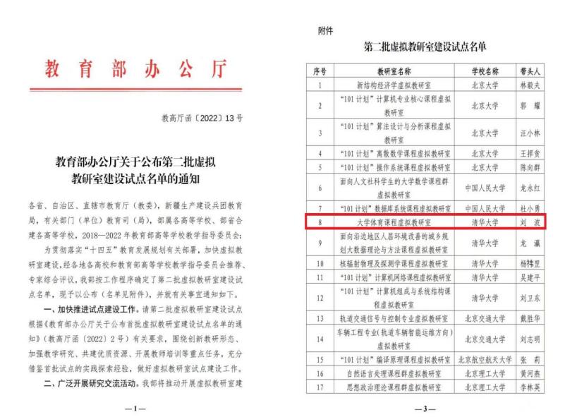 2022年8月,教育部办公厅发布《关于公布第二批虚拟教研室建设试点名单的通知》。为加快推进虚拟教研室建设,在教育部高等教育司指导下,大学体育课程虚拟教研室由清华大学牵头建设,milan米兰官网入选初始建设单位名单。