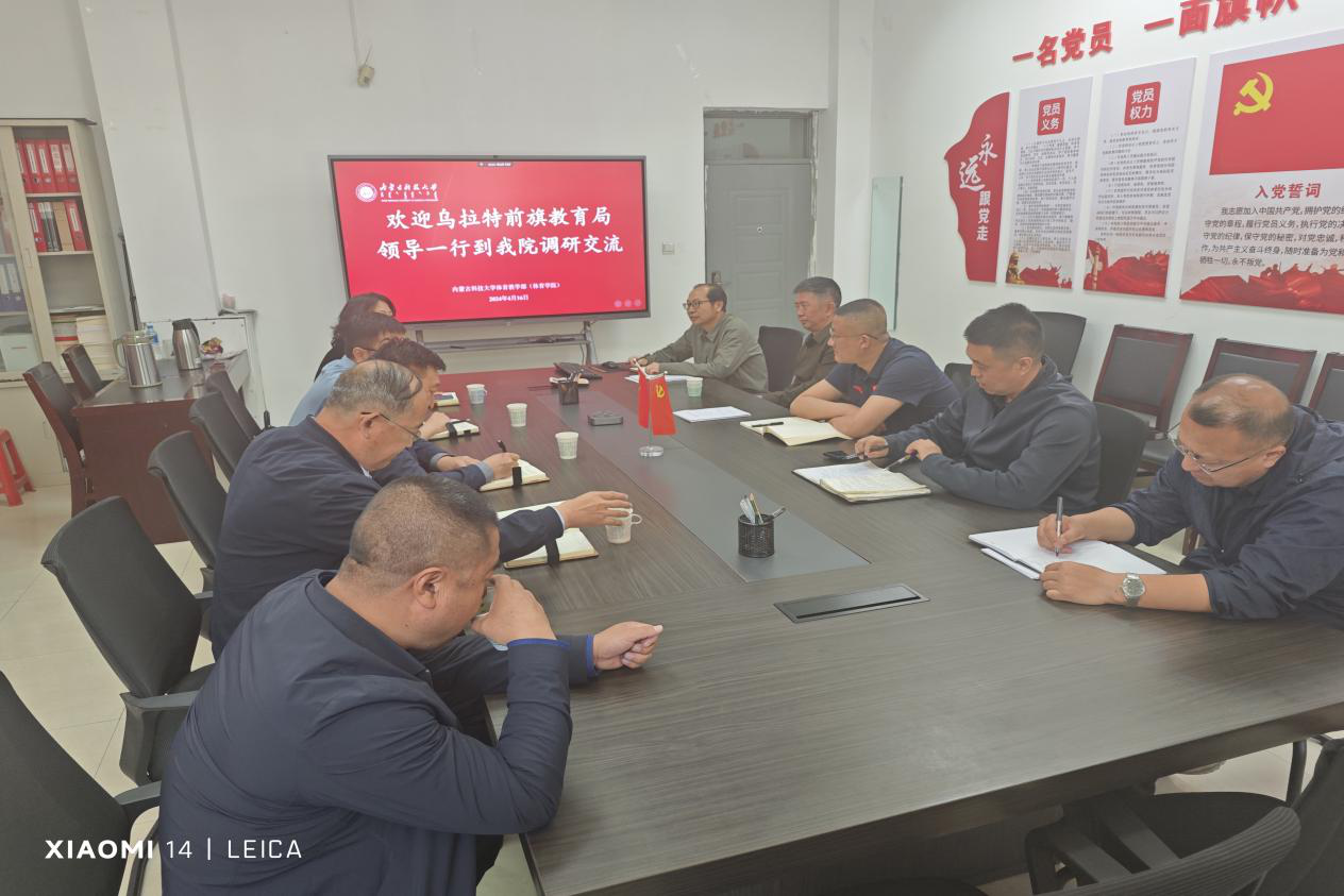 4月16日下午,乌拉特前旗教育局局长杨国栋、副局长胡群及局机关体卫艺股工作人员,来milan米兰官网milan米兰官网交流、调研体育教育合作共建项目,助力推动乌拉特前旗体育教育高质量发展。我院党委书记苗凯、院长白楠、党委副书记唐国桥、副院长张新民、田瑞峰教授参加此次交流活动。在座谈会上,双方就学校体育工作长期合作、乌拉特前旗学校足球教练员长期培训、milan米兰官网学生实训基地建设、足球直通车等项目进行深入的交流探讨,达成了预期效果。院长白楠明确表示,愿意支持乌拉特前旗提出的帮扶意向和需求,针对性的开展体育师资培训、足球教练员培训和足球训练工作、足球特长生培养规划等对口帮扶项目。