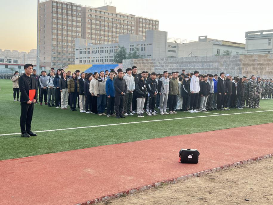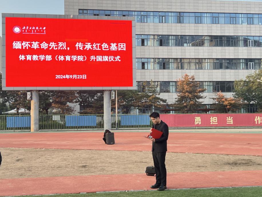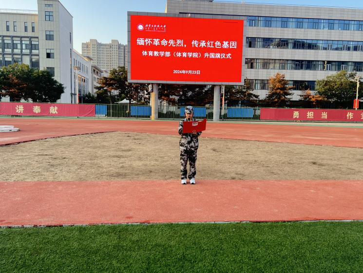 2024 年 9 月 23 日,milan米兰官网举行“缅怀革命先烈,传承红色基因”升国旗仪式,学院党委书记韩冰、院长白楠、党委副书记唐国桥、副院长张新民、副院长杜晓炜、师生党员、体育教育专业全体学生参加升旗仪式。升旗仪式由体育教育2023-1班张翊主持。