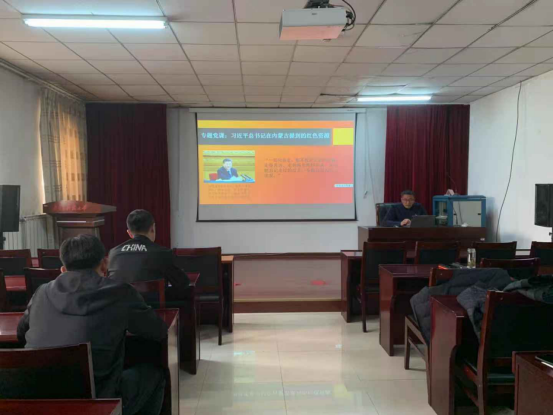 4月15日下午,milan米兰官网副主任(副院长)苗凯为全体教职工做了习近平总书记在内蒙古提到的红色资源专题党课,党课在二楼多媒体教室进行。