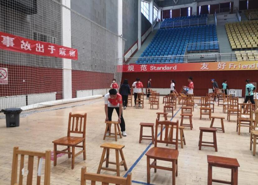 志愿服务分为两部分,一部分同学有序摆放留观区座椅,另一部分同学对体育馆室外台阶处的烟头、纸屑、塑料瓶等垃圾进行清理。